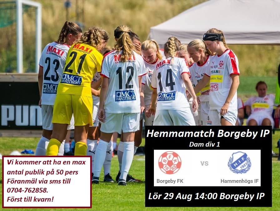 Dags för hemmamatch på Borgeby IP för vårt seniorlag i dam division 1 mot Hammenhög. Vi kommer att i enlighet med de senaste riktlinjer som finns vad det gäller Corona öppna upp för en begränsad publik på max 50 personer. Föranmälan krävs för inträde sms till 0704-762858. Biljettpris 60 kr. Först till kvarn!